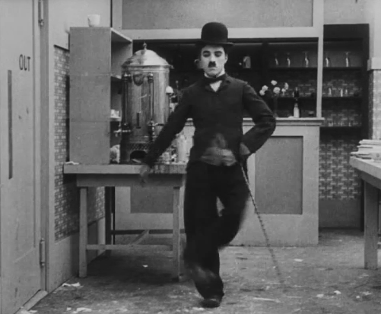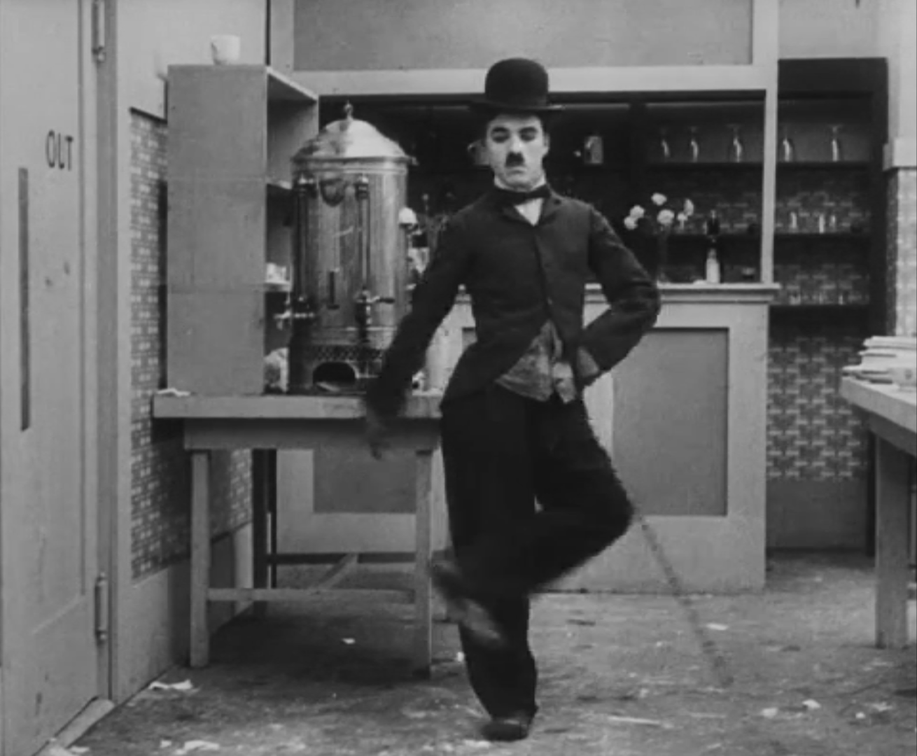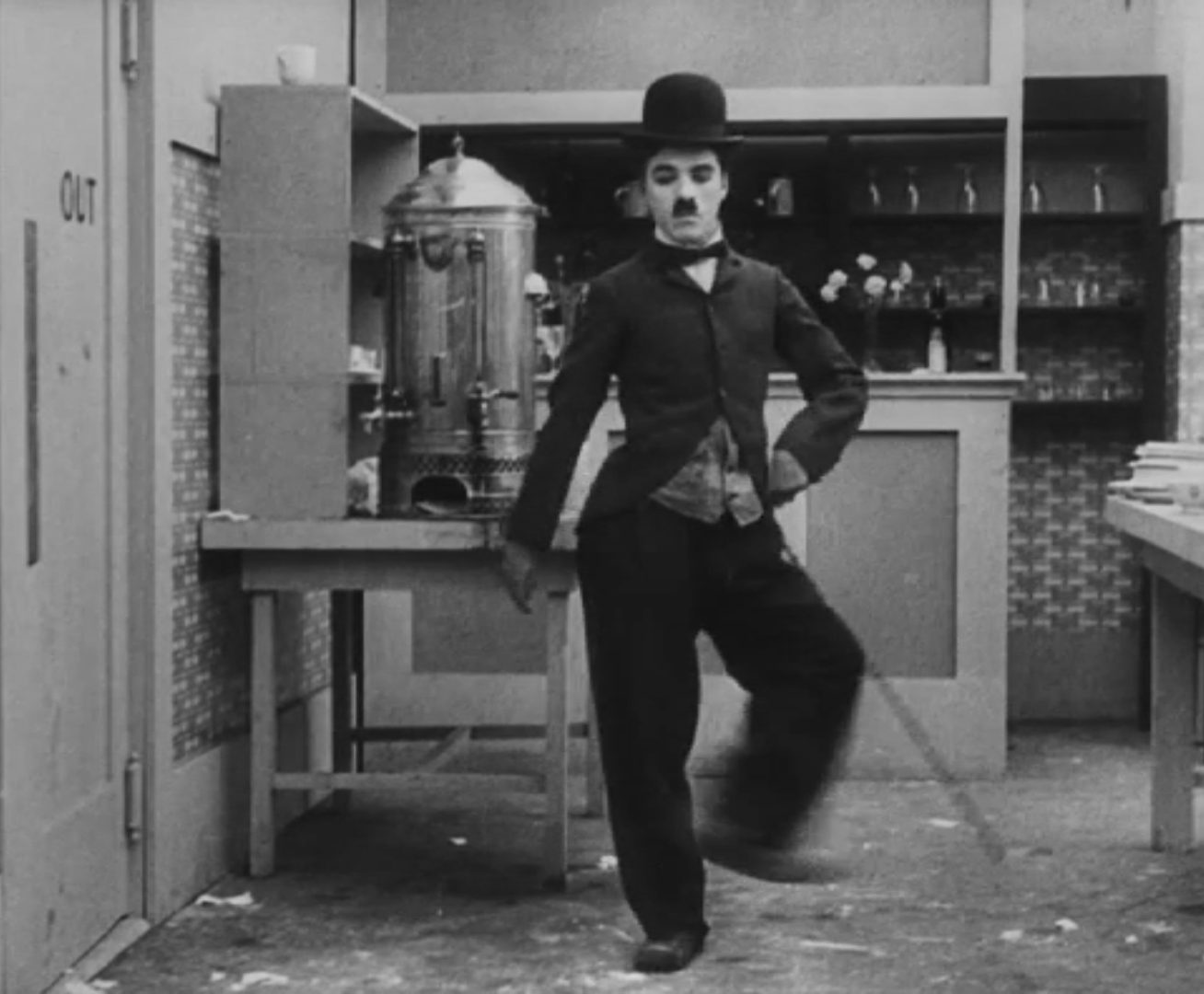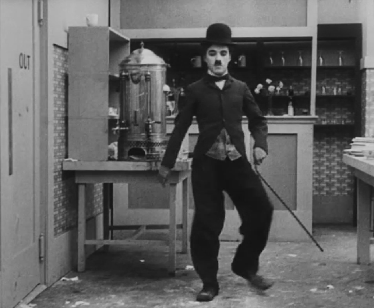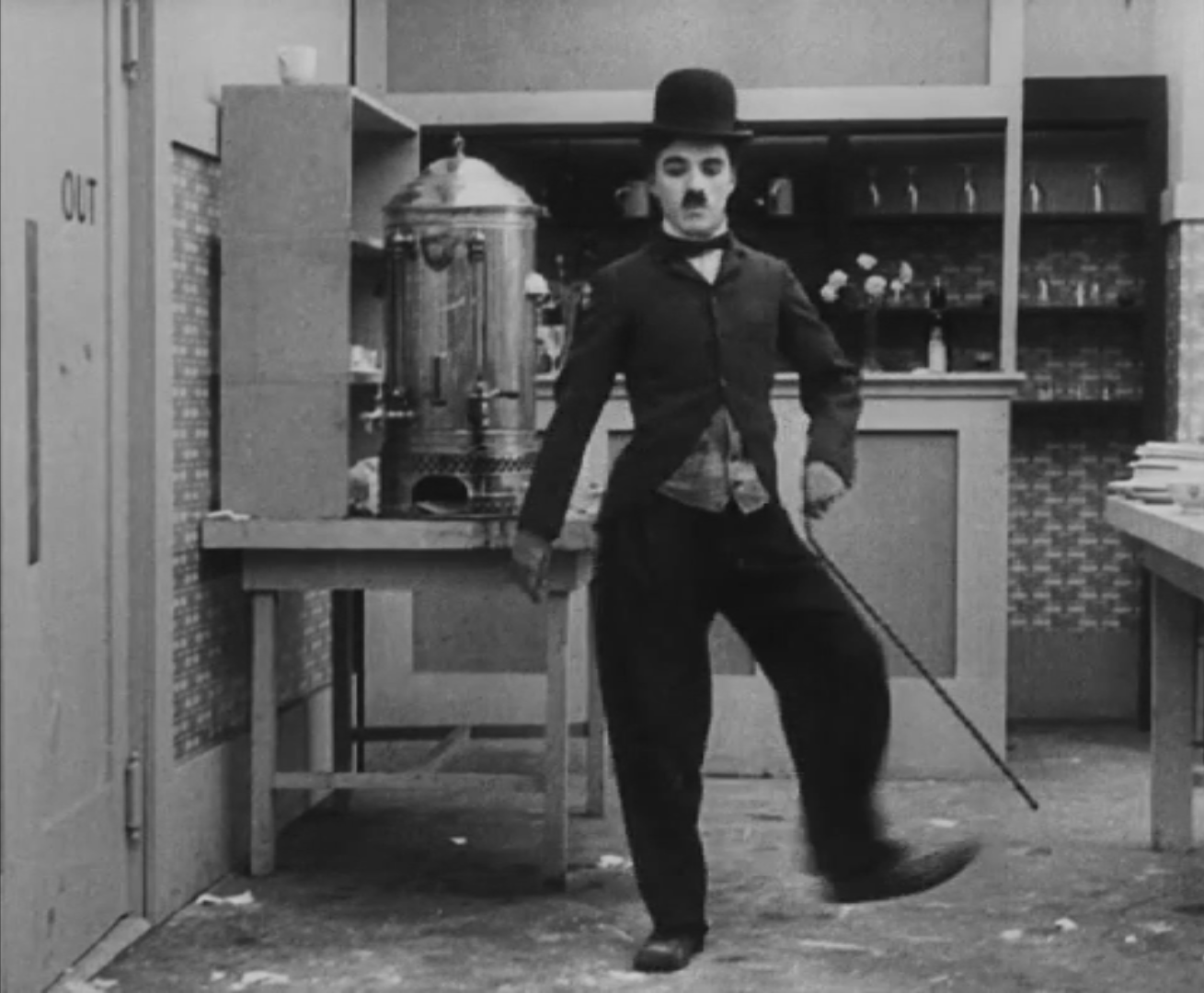 Tout dans sa gestuelle est une danse2 : les pieds en canard forcent l’arc des genoux qui entraîne l’ondulation des hanches, donne à la démarche son rythme chaloupé et détermine cet espace triangulaire qui jamais ne se comble entre les pattes du vagabond – une jambe droite et l’autre pliée – cette fente ou cette fracture de la silhouette, qui prolonge celle de la veste, ouverte au niveau du ventre, répète les multiples contradictions du personnage, abondamment commentées, froc trop grand et veston trop petit du vagabond-gentleman. Ce costume, cette silhouette et cette démarche nous sont si familiers qu’il est n’est pas aisé de remarquer cette soudaine dissonance : dans les dernières secondes de ce plan, lorsque Charlot se tourne de profil face à la caméra pour quitter la cuisine du restaurant, il marche autrement. Les pieds reviennent légèrement dans leur axe naturel, les genoux se resserrent, le vagabond allonge le pas et cette démarche tantôt si singulière semble tout à coup presque normale, un peu banale.