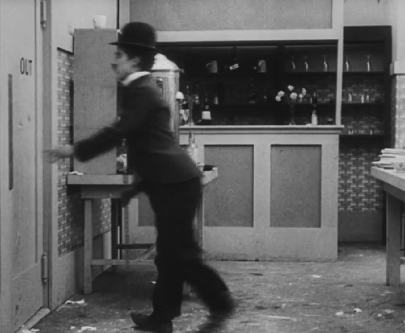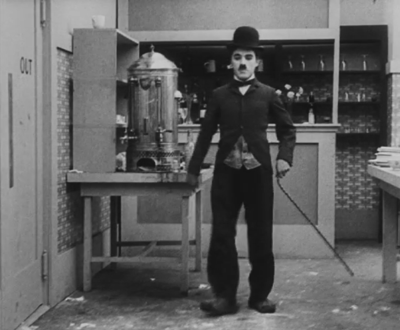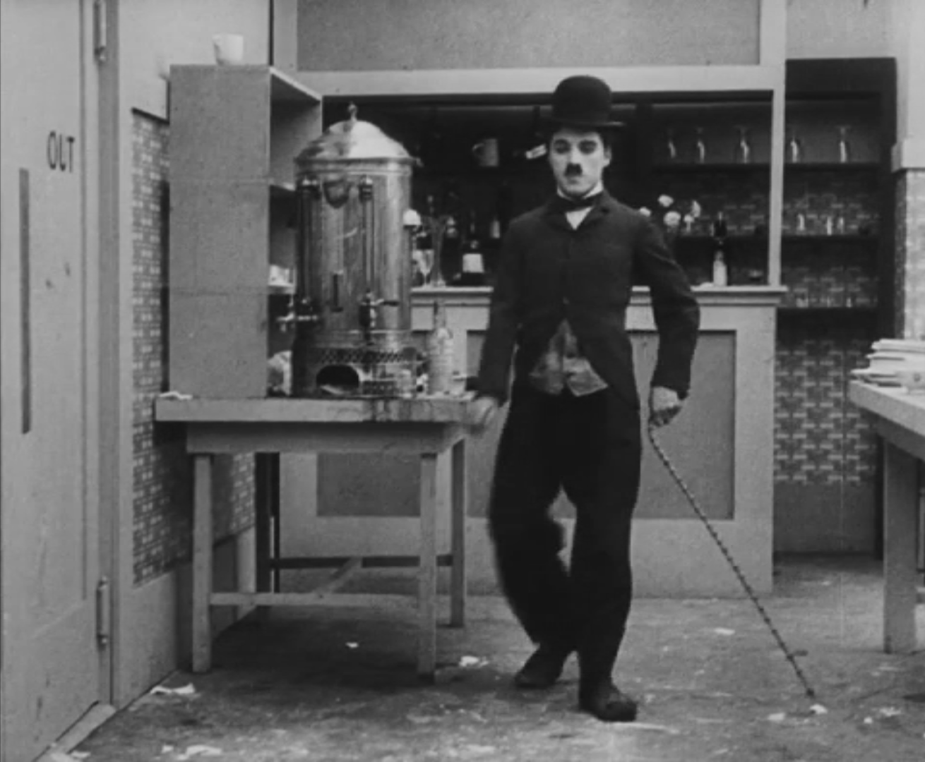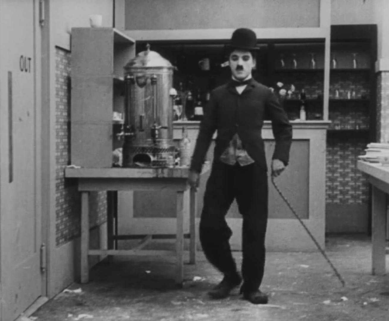 Tout dans sa gestuelle est une danse2 : les pieds en canard forcent l’arc des genoux qui entraîne l’ondulation des hanches, donne à la démarche son rythme chaloupé et détermine cet espace triangulaire qui jamais ne se comble entre les pattes du vagabond – une jambe droite et l’autre pliée – cette fente ou cette fracture de la silhouette, qui prolonge celle de la veste, ouverte au niveau du ventre, répète les multiples contradictions du personnage, abondamment commentées, froc trop grand et veston trop petit du vagabond-gentleman. Ce costume, cette silhouette et cette démarche nous sont si familiers qu’il est n’est pas aisé de remarquer cette soudaine dissonance : dans les dernières secondes de ce plan, lorsque Charlot se tourne de profil face à la caméra pour quitter la cuisine du restaurant, il marche autrement. Les pieds reviennent légèrement dans leur axe naturel, les genoux se resserrent, le vagabond allonge le pas et cette démarche tantôt si singulière semble tout à coup presque normale, un peu banale.