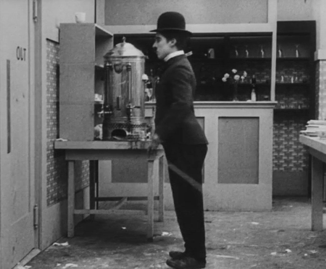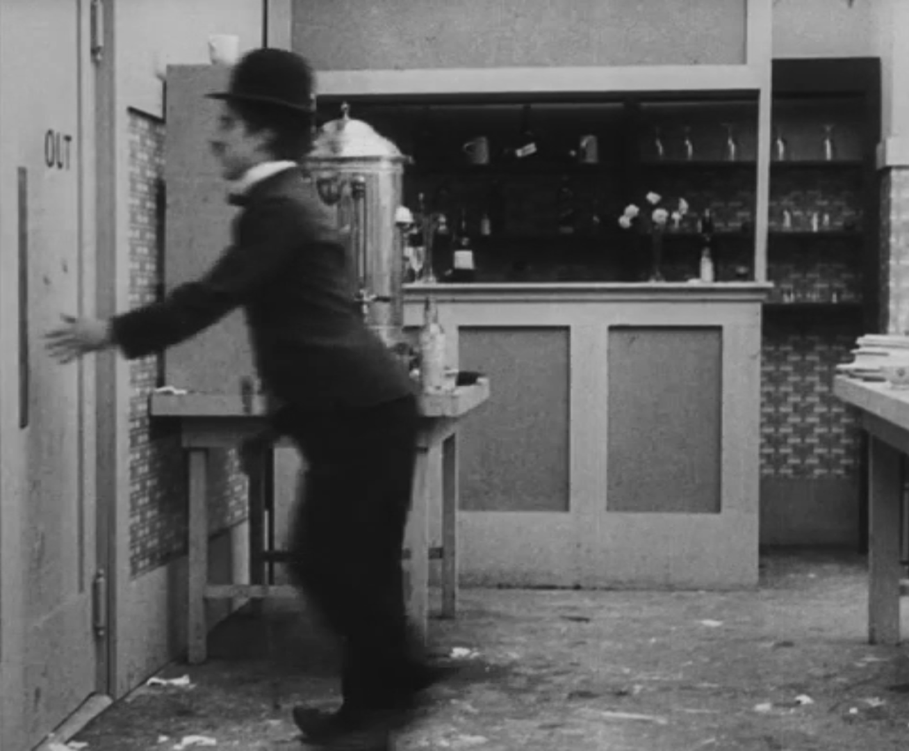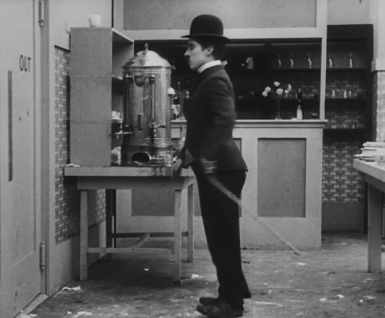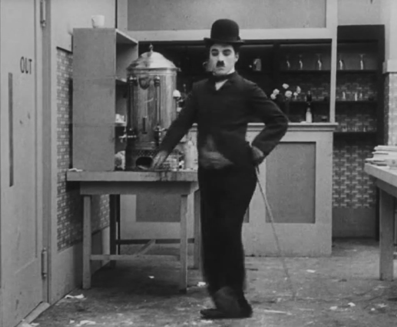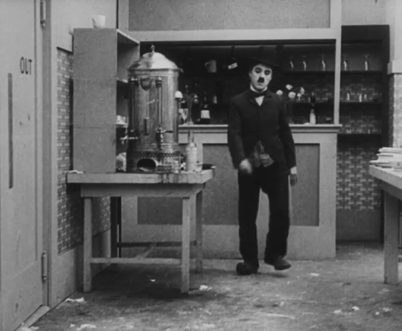 Tout dans sa gestuelle est une danse2 : les pieds en canard forcent l’arc des genoux qui entraîne l’ondulation des hanches, donne à la démarche son rythme chaloupé et détermine cet espace triangulaire qui jamais ne se comble entre les pattes du vagabond – une jambe droite et l’autre pliée – cette fente ou cette fracture de la silhouette, qui prolonge celle de la veste, ouverte au niveau du ventre, répète les multiples contradictions du personnage, abondamment commentées, froc trop grand et veston trop petit du vagabond-gentleman. Ce costume, cette silhouette et cette démarche nous sont si familiers qu’il est n’est pas aisé de remarquer cette soudaine dissonance : dans les dernières secondes de ce plan, lorsque Charlot se tourne de profil face à la caméra pour quitter la cuisine du restaurant, il marche autrement. Les pieds reviennent légèrement dans leur axe naturel, les genoux se resserrent, le vagabond allonge le pas et cette démarche tantôt si singulière semble tout à coup presque normale, un peu banale.