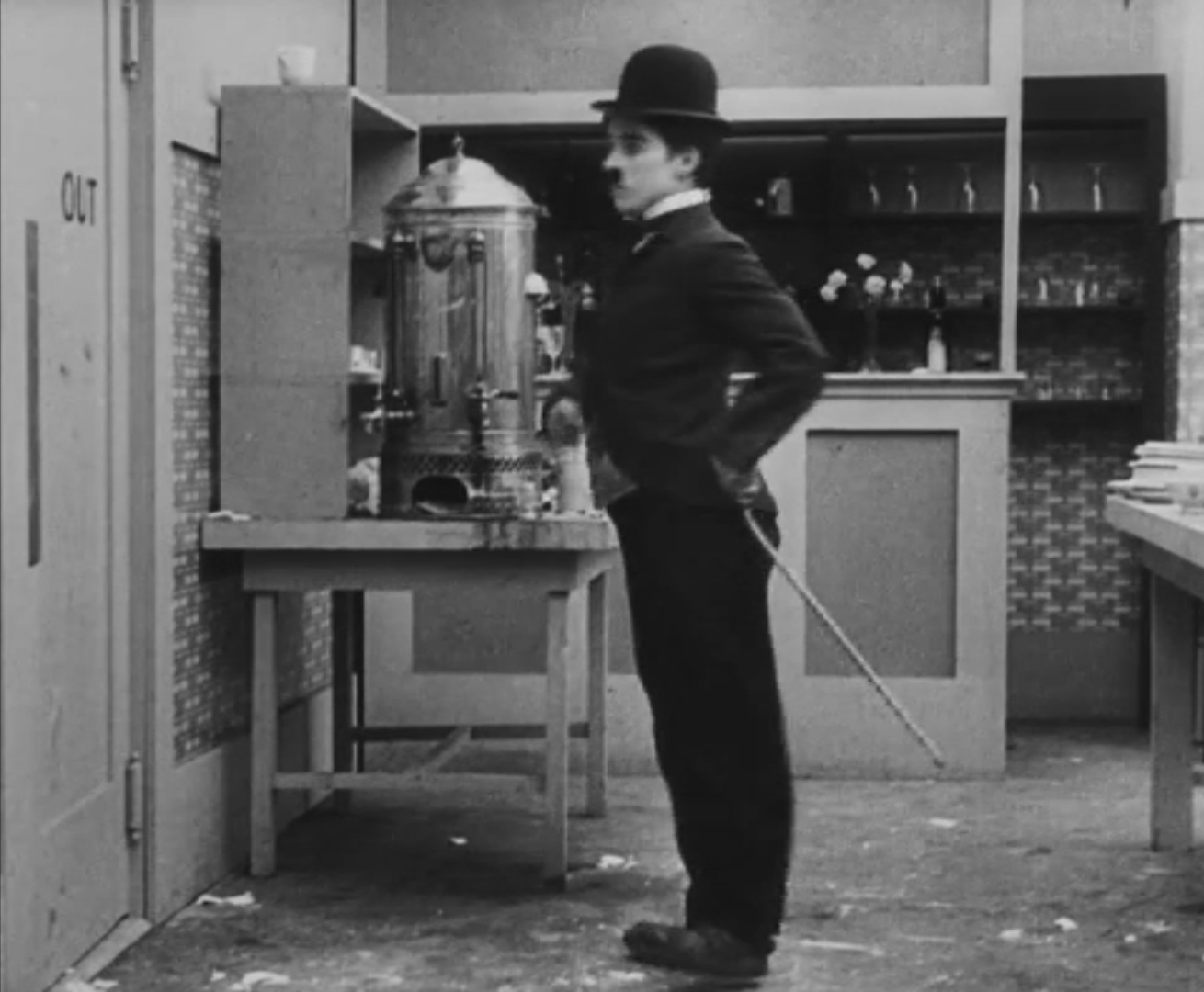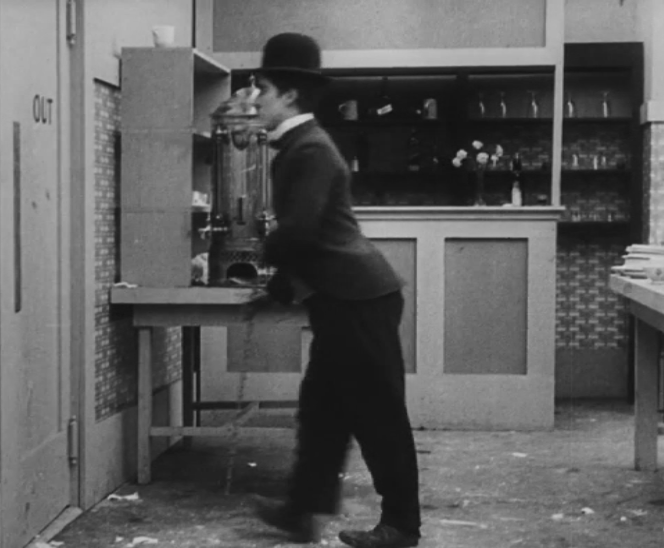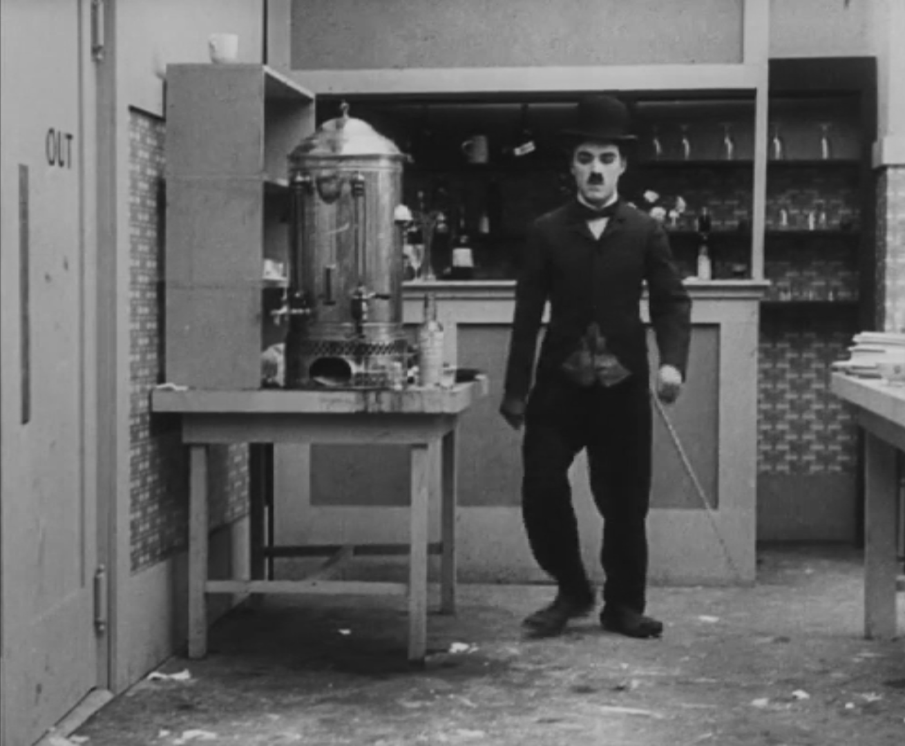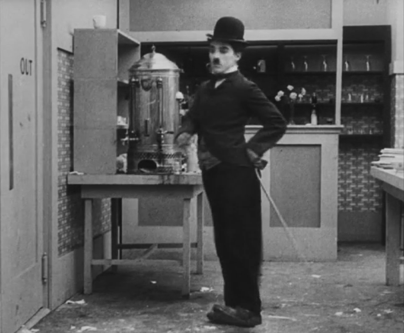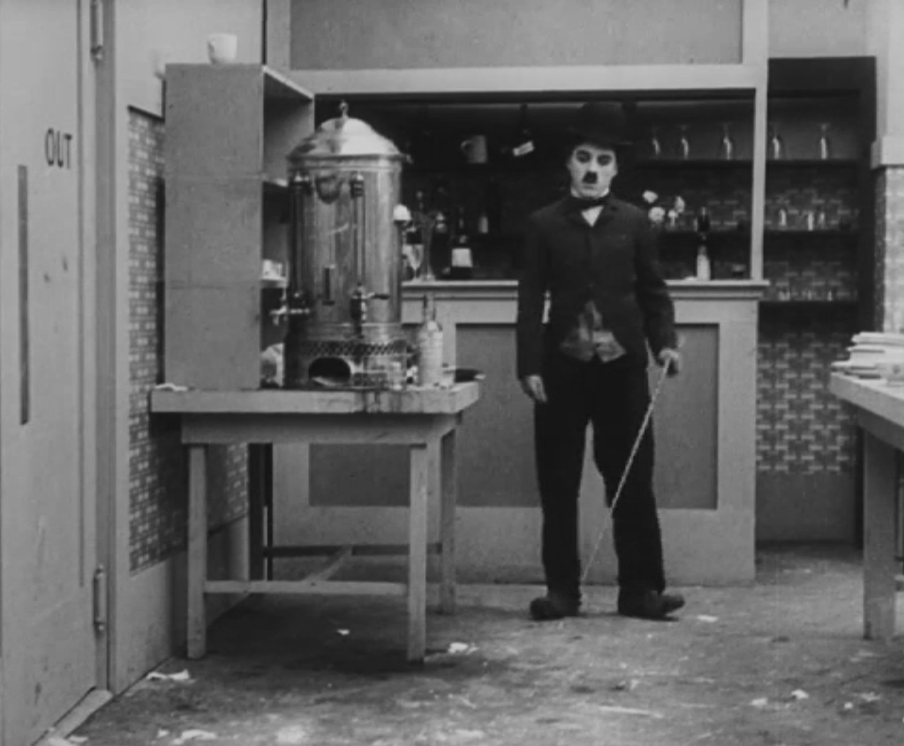 Tout dans sa gestuelle est une danse2 : les pieds en canard forcent l’arc des genoux qui entraîne l’ondulation des hanches, donne à la démarche son rythme chaloupé et détermine cet espace triangulaire qui jamais ne se comble entre les pattes du vagabond – une jambe droite et l’autre pliée – cette fente ou cette fracture de la silhouette, qui prolonge celle de la veste, ouverte au niveau du ventre, répète les multiples contradictions du personnage, abondamment commentées, froc trop grand et veston trop petit du vagabond-gentleman. Ce costume, cette silhouette et cette démarche nous sont si familiers qu’il est n’est pas aisé de remarquer cette soudaine dissonance : dans les dernières secondes de ce plan, lorsque Charlot se tourne de profil face à la caméra pour quitter la cuisine du restaurant, il marche autrement. Les pieds reviennent légèrement dans leur axe naturel, les genoux se resserrent, le vagabond allonge le pas et cette démarche tantôt si singulière semble tout à coup presque normale, un peu banale.