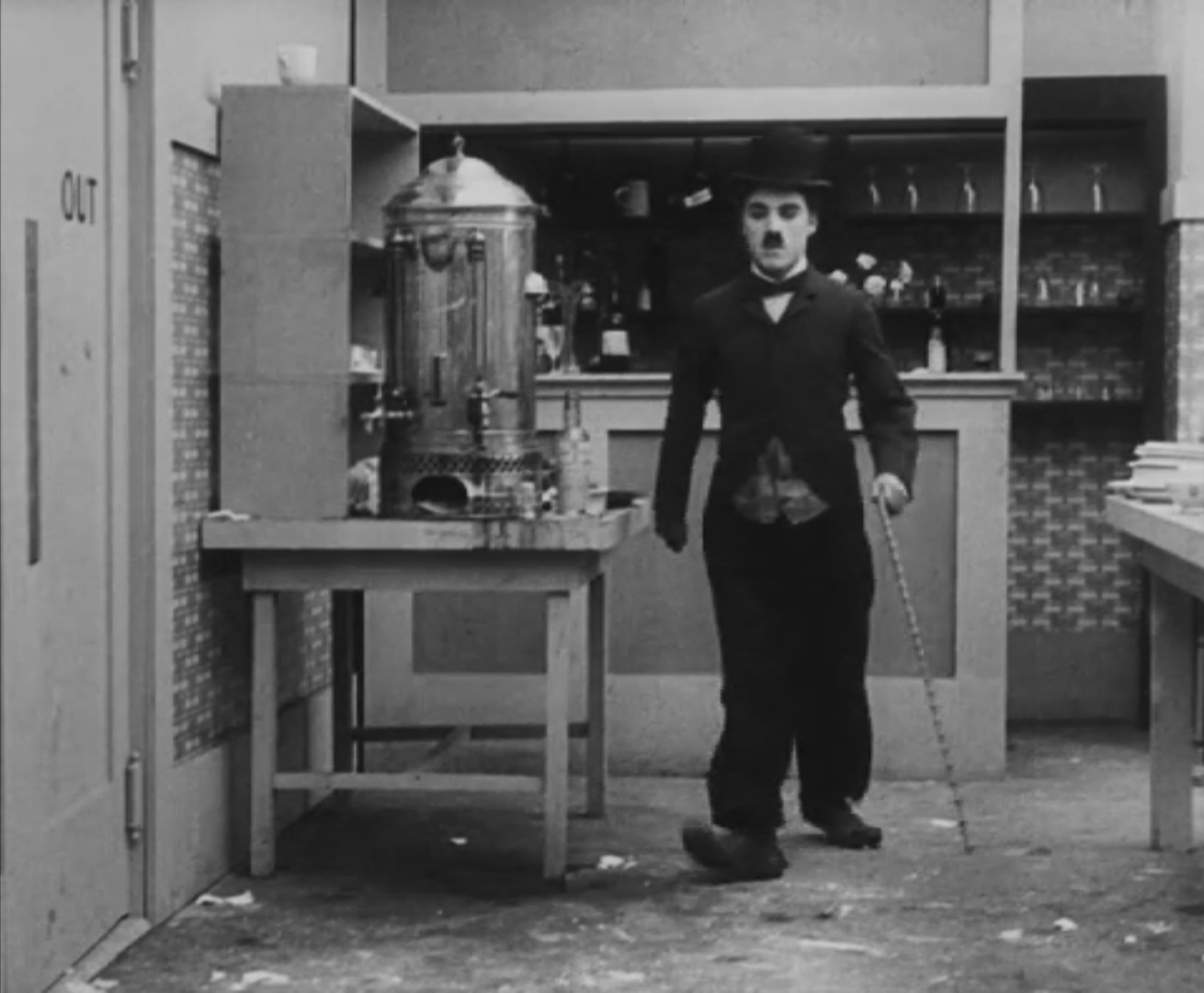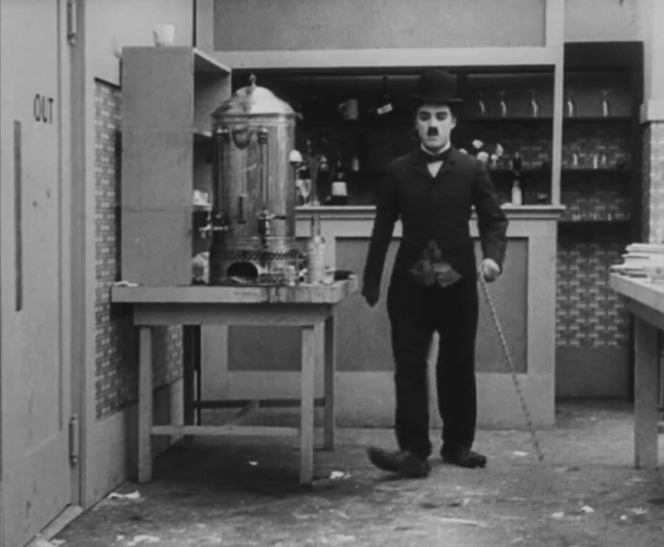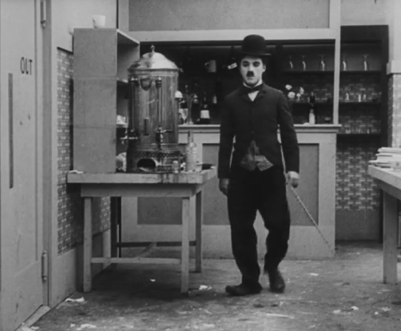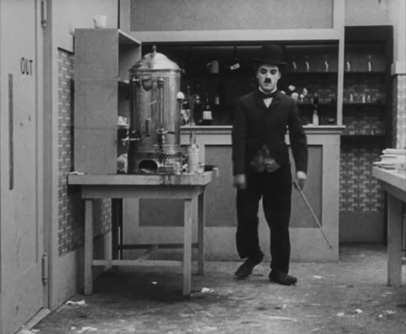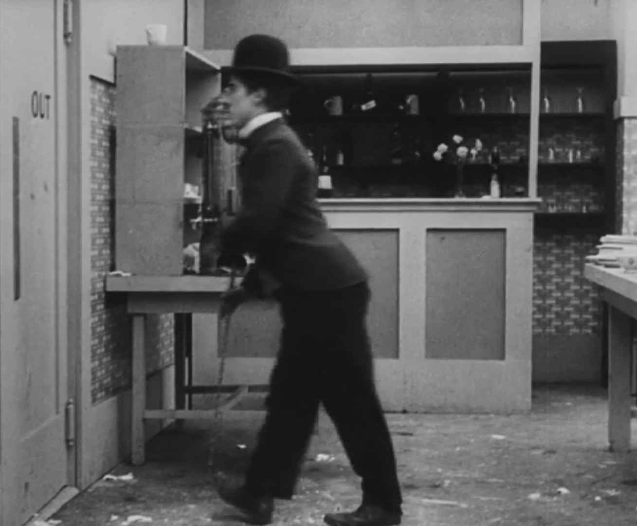 Tout dans sa gestuelle est une danse2 : les pieds en canard forcent l’arc des genoux qui entraîne l’ondulation des hanches, donne à la démarche son rythme chaloupé et détermine cet espace triangulaire qui jamais ne se comble entre les pattes du vagabond – une jambe droite et l’autre pliée – cette fente ou cette fracture de la silhouette, qui prolonge celle de la veste, ouverte au niveau du ventre, répète les multiples contradictions du personnage, abondamment commentées, froc trop grand et veston trop petit du vagabond-gentleman. Ce costume, cette silhouette et cette démarche nous sont si familiers qu’il est n’est pas aisé de remarquer cette soudaine dissonance : dans les dernières secondes de ce plan, lorsque Charlot se tourne de profil face à la caméra pour quitter la cuisine du restaurant, il marche autrement. Les pieds reviennent légèrement dans leur axe naturel, les genoux se resserrent, le vagabond allonge le pas et cette démarche tantôt si singulière semble tout à coup presque normale, un peu banale.