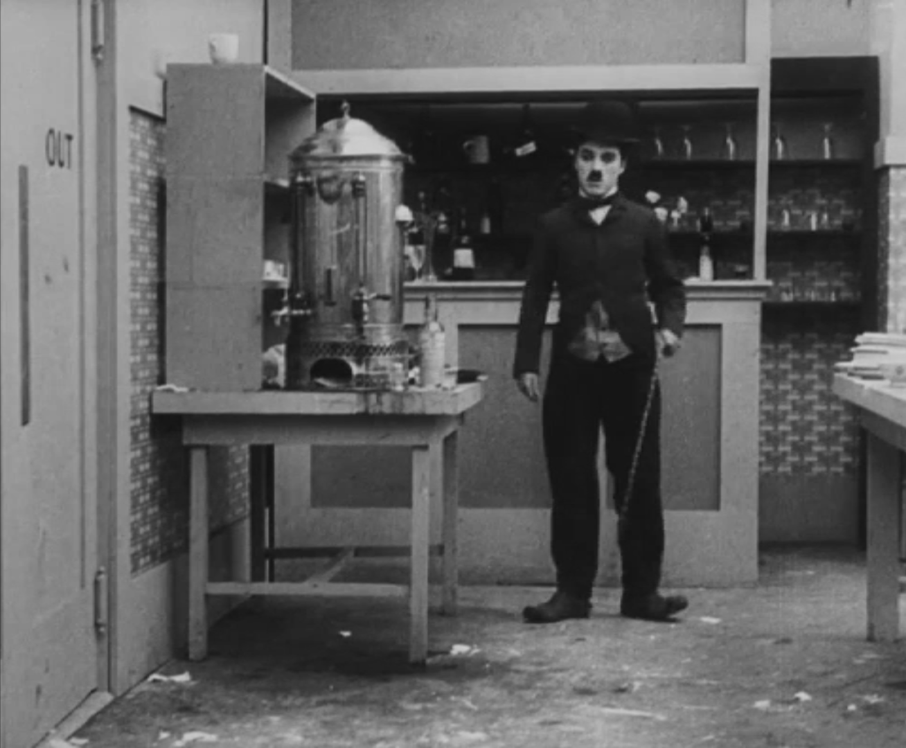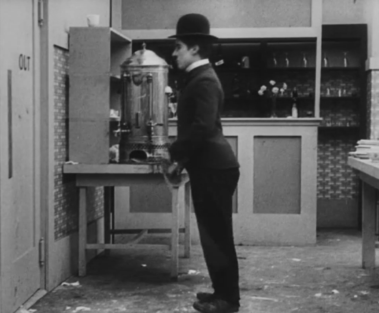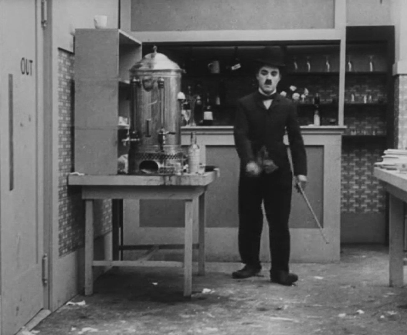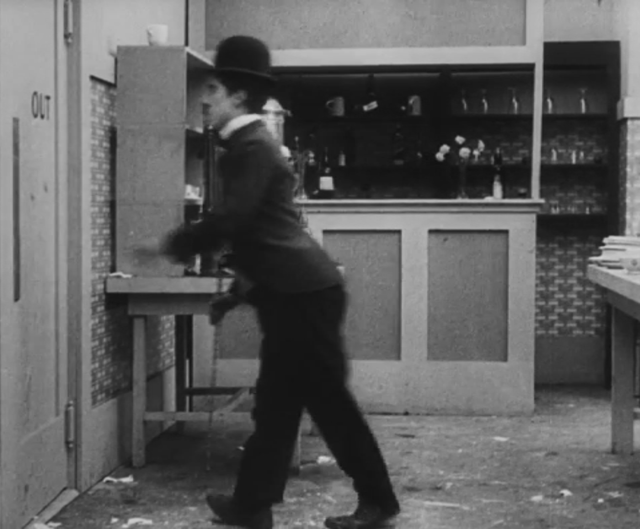 Tout dans sa gestuelle est une danse2 : les pieds en canard forcent l’arc des genoux qui entraîne l’ondulation des hanches, donne à la démarche son rythme chaloupé et détermine cet espace triangulaire qui jamais ne se comble entre les pattes du vagabond – une jambe droite et l’autre pliée – cette fente ou cette fracture de la silhouette, qui prolonge celle de la veste, ouverte au niveau du ventre, répète les multiples contradictions du personnage, abondamment commentées, froc trop grand et veston trop petit du vagabond-gentleman. Ce costume, cette silhouette et cette démarche nous sont si familiers qu’il est n’est pas aisé de remarquer cette soudaine dissonance : dans les dernières secondes de ce plan, lorsque Charlot se tourne de profil face à la caméra pour quitter la cuisine du restaurant, il marche autrement. Les pieds reviennent légèrement dans leur axe naturel, les genoux se resserrent, le vagabond allonge le pas et cette démarche tantôt si singulière semble tout à coup presque normale, un peu banale.