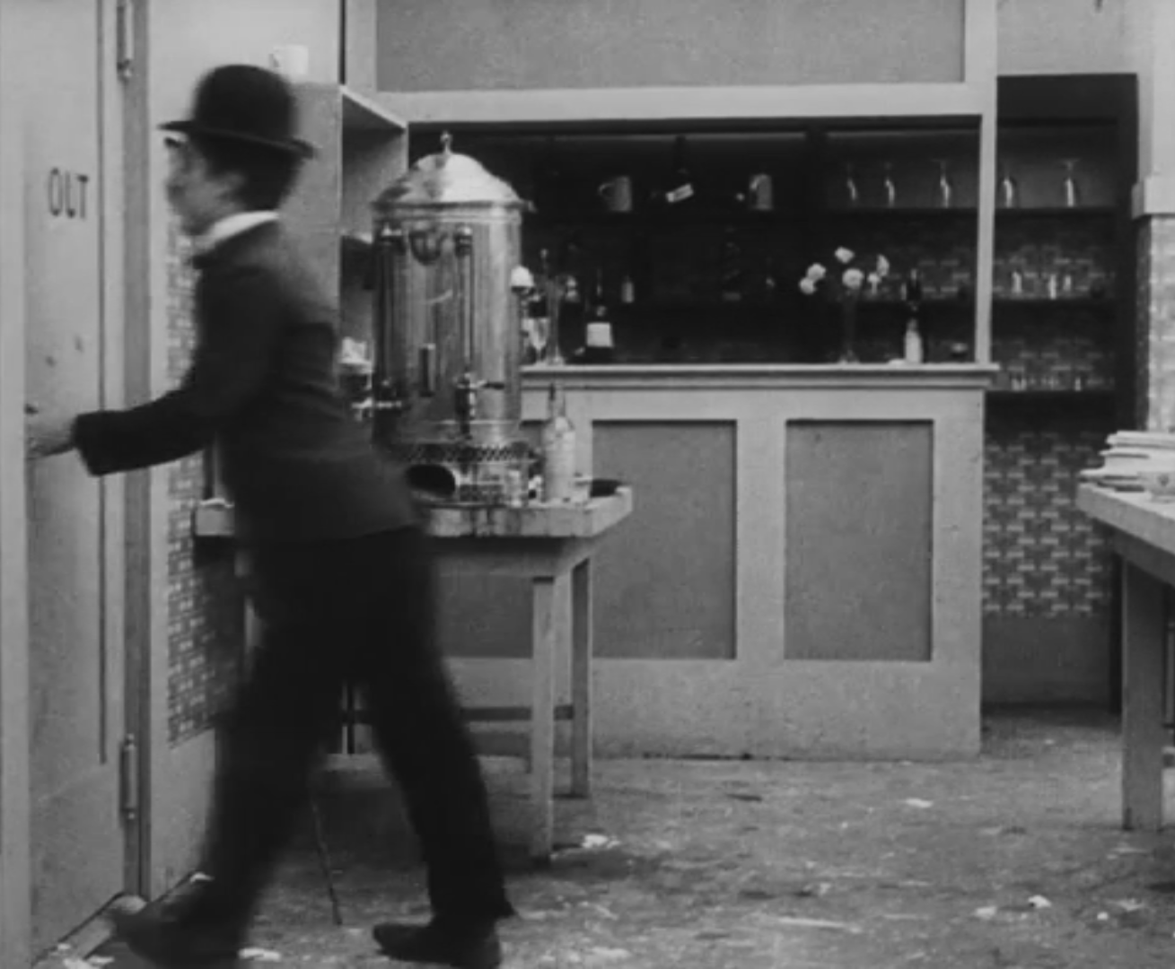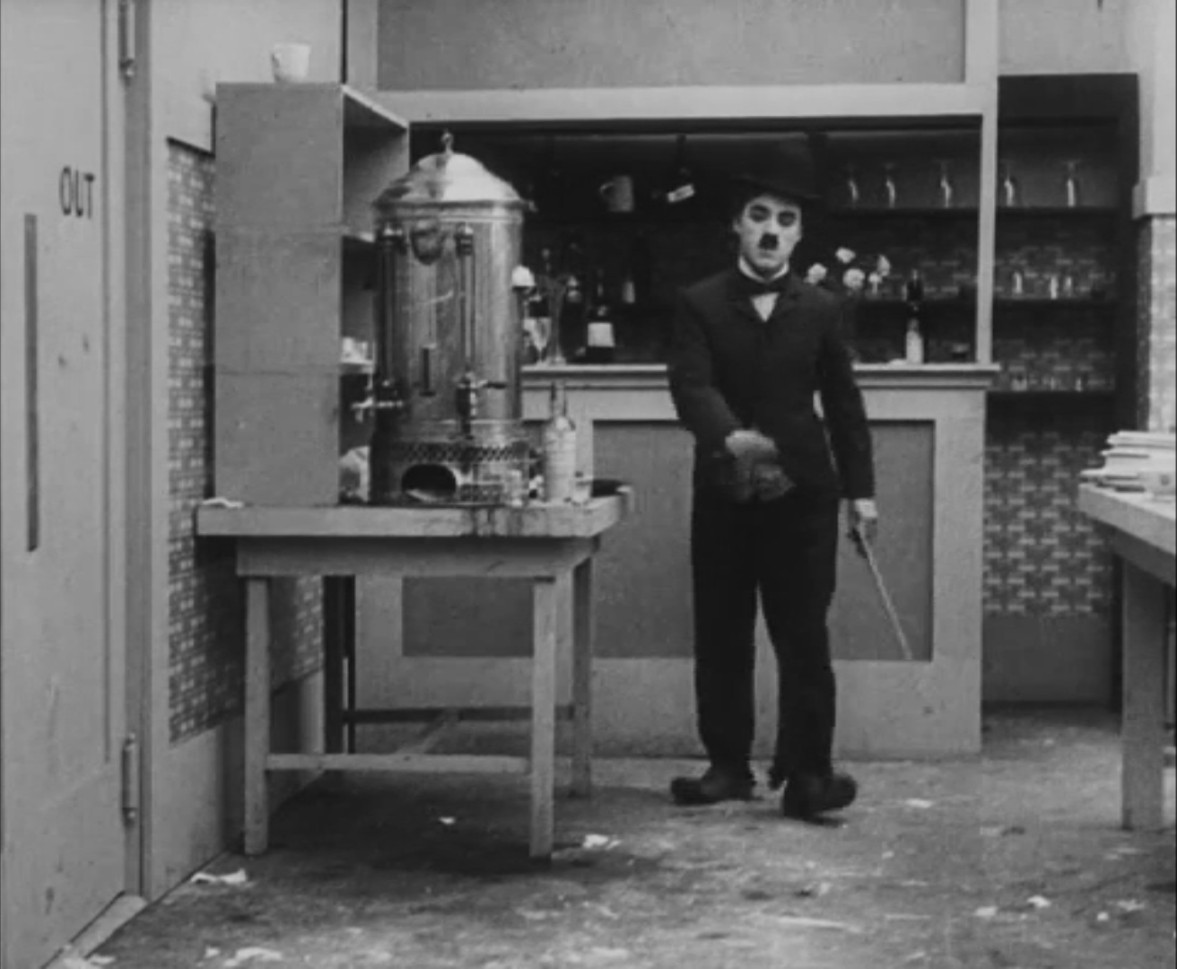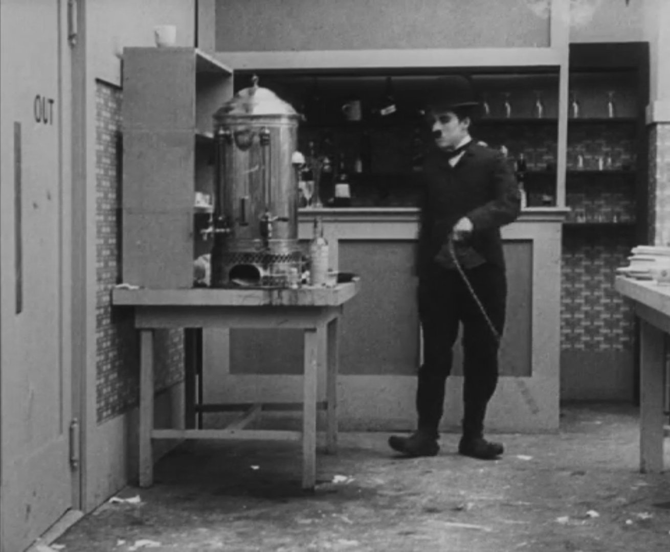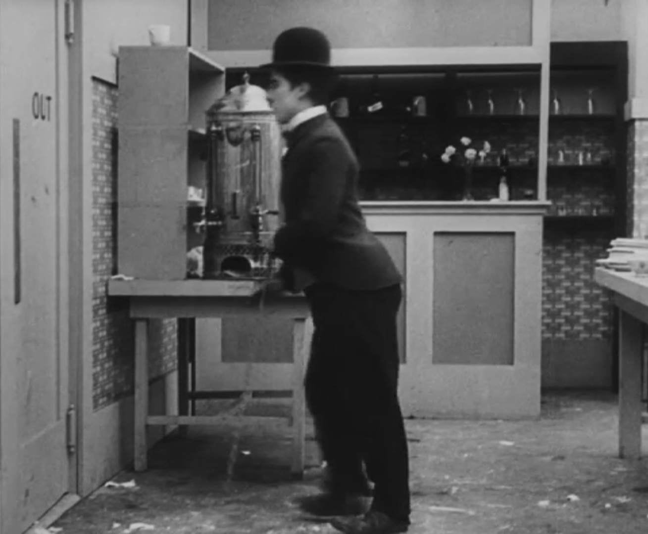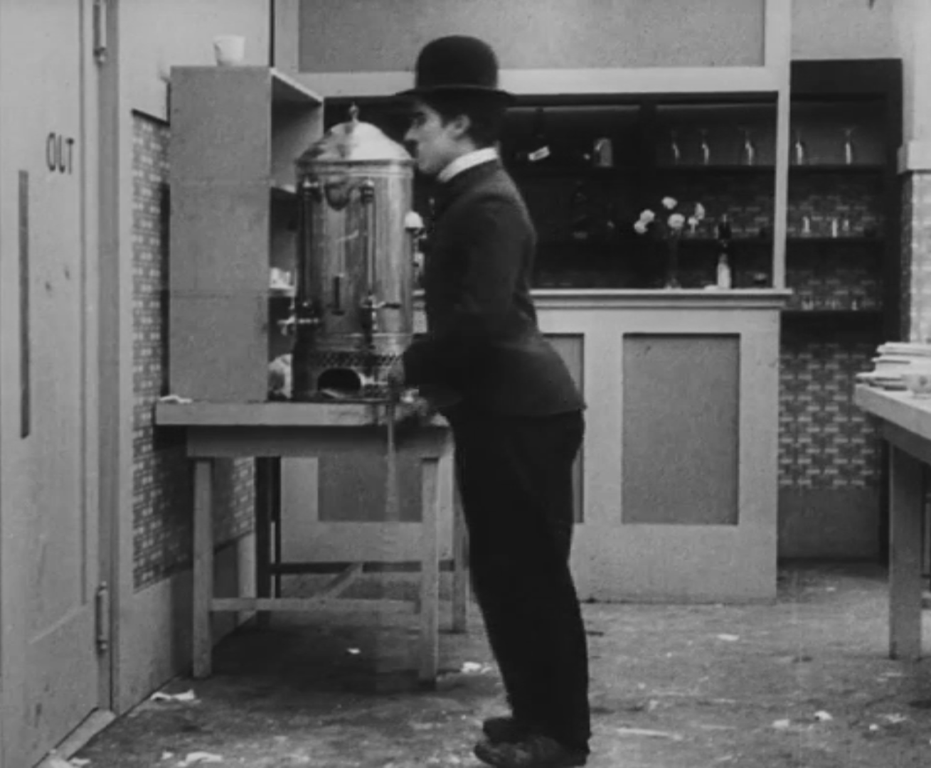 Tout dans sa gestuelle est une danse2 : les pieds en canard forcent l’arc des genoux qui entraîne l’ondulation des hanches, donne à la démarche son rythme chaloupé et détermine cet espace triangulaire qui jamais ne se comble entre les pattes du vagabond – une jambe droite et l’autre pliée – cette fente ou cette fracture de la silhouette, qui prolonge celle de la veste, ouverte au niveau du ventre, répète les multiples contradictions du personnage, abondamment commentées, froc trop grand et veston trop petit du vagabond-gentleman. Ce costume, cette silhouette et cette démarche nous sont si familiers qu’il est n’est pas aisé de remarquer cette soudaine dissonance : dans les dernières secondes de ce plan, lorsque Charlot se tourne de profil face à la caméra pour quitter la cuisine du restaurant, il marche autrement. Les pieds reviennent légèrement dans leur axe naturel, les genoux se resserrent, le vagabond allonge le pas et cette démarche tantôt si singulière semble tout à coup presque normale, un peu banale.