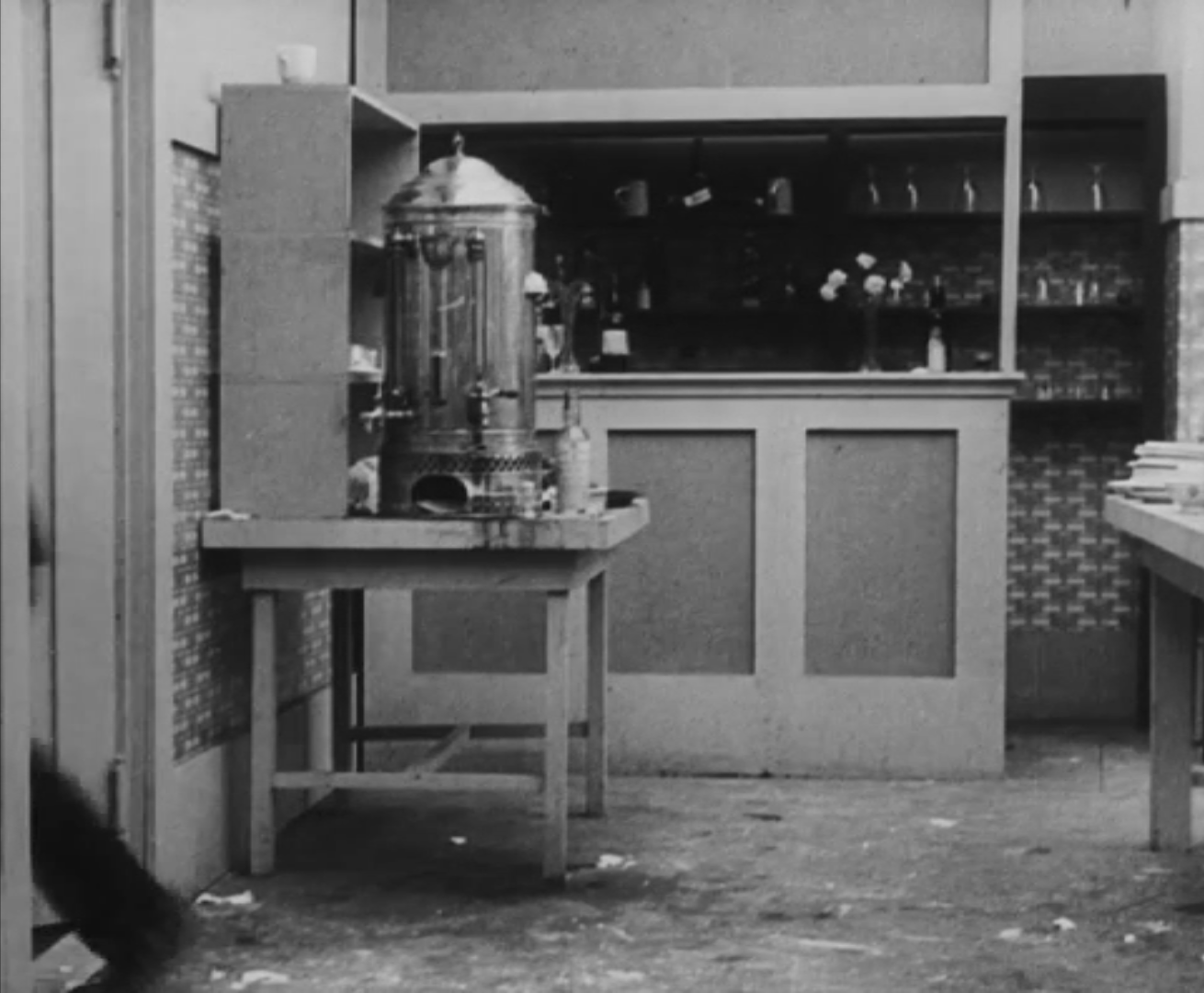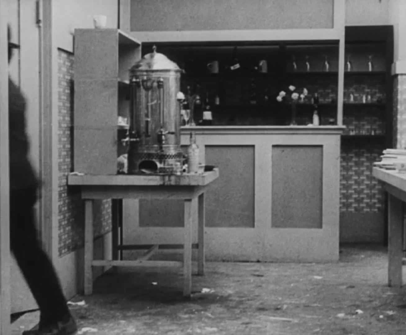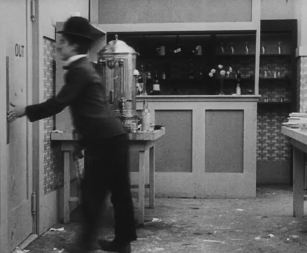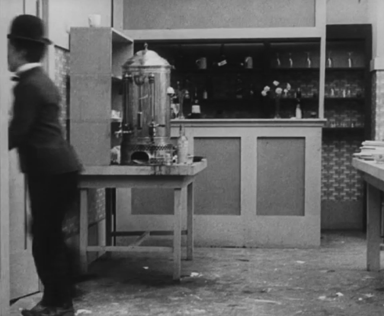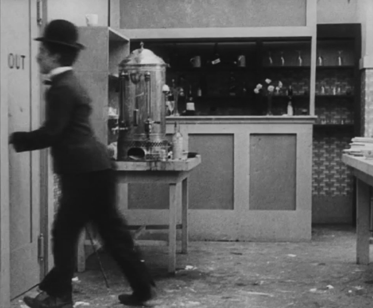 Tout dans sa gestuelle est une danse2 : les pieds en canard forcent l’arc des genoux qui entraîne l’ondulation des hanches, donne à la démarche son rythme chaloupé et détermine cet espace triangulaire qui jamais ne se comble entre les pattes du vagabond – une jambe droite et l’autre pliée – cette fente ou cette fracture de la silhouette, qui prolonge celle de la veste, ouverte au niveau du ventre, répète les multiples contradictions du personnage, abondamment commentées, froc trop grand et veston trop petit du vagabond-gentleman. Ce costume, cette silhouette et cette démarche nous sont si familiers qu’il est n’est pas aisé de remarquer cette soudaine dissonance : dans les dernières secondes de ce plan, lorsque Charlot se tourne de profil face à la caméra pour quitter la cuisine du restaurant, il marche autrement. Les pieds reviennent légèrement dans leur axe naturel, les genoux se resserrent, le vagabond allonge le pas et cette démarche tantôt si singulière semble tout à coup presque normale, un peu banale.