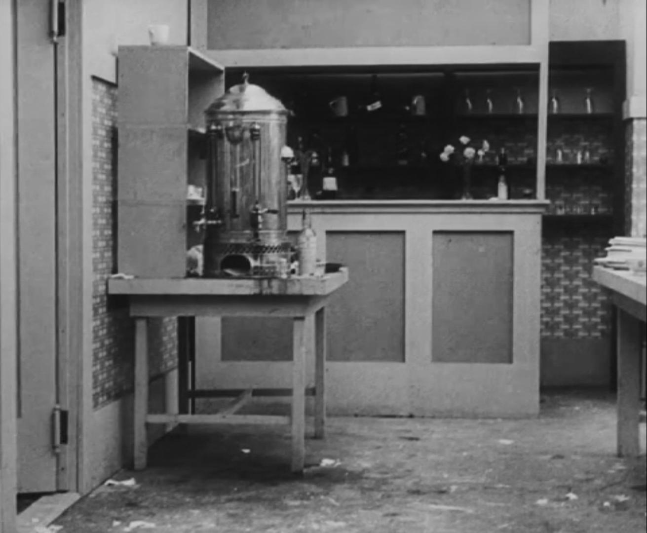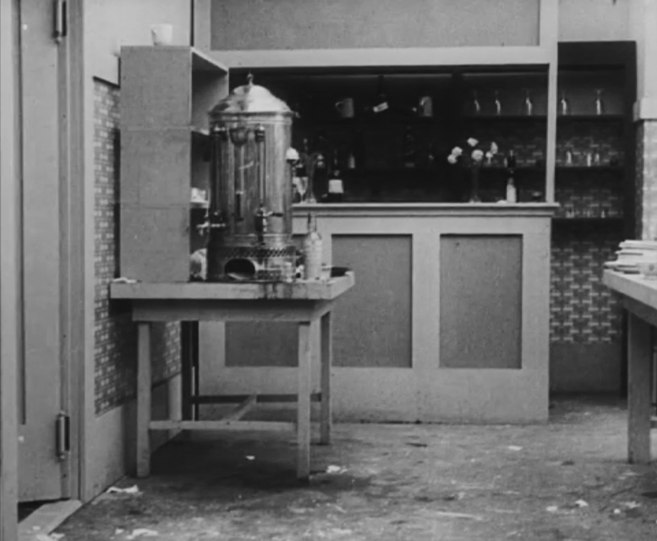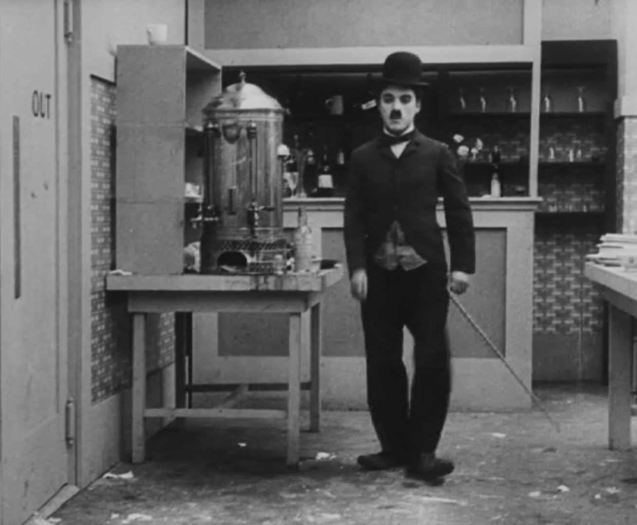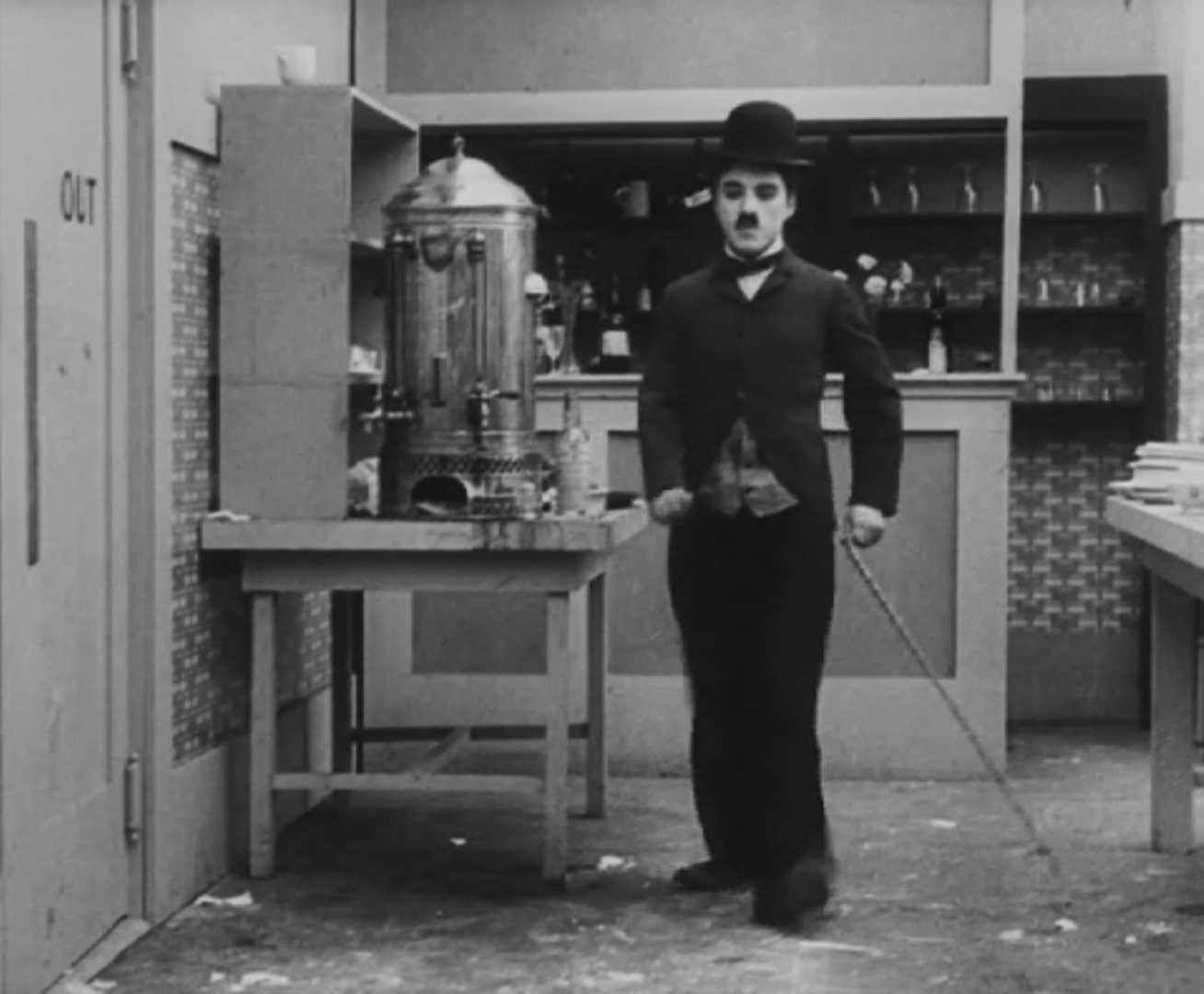 Le chapeau droit sur le crâne, la badine oblique, garrotté d’un col blanc à la lisière du menton, Charlot, dynamique, quitte les cuisines à la fin de son service. Il avance jusqu’au premier plan, jette son pied gauche vers la droite d’un coup sec, entraînant le reste du corps dans un virage à angle droit d’une précision géométrique, et disparaît derrière une porte battante. On sait la détermination qu’il fallut à Chaplin pour imposer ce type de plan ; deux ans plus tôt, en 1914, sous contrat à la Keystone, l’acteur est dirigé par des metteurs en scène comme Henry Lehrman, peu sensibles à ses talents de mime – les comédies sont trépidantes, le montage, convulsif. Très vite, Chaplin comprend que son talent ne peut s’exprimer à une telle cadence : pour déjouer les ciseaux des monteurs qui coupent ses meilleures scènes, l’acteur entre par le fond du décor, occupe la profondeur de champ et la largeur du cadre pour allonger au maximum sa présence à l’écran1. En 1916, lorsqu’il tourne The Rink (Charlot patine), dont ce plan est extrait, il est l’acteur le mieux payé d’Hollywood, réalise ses propres comédies et sa seule démarche suffit à provoquer l’hilarité des foules.